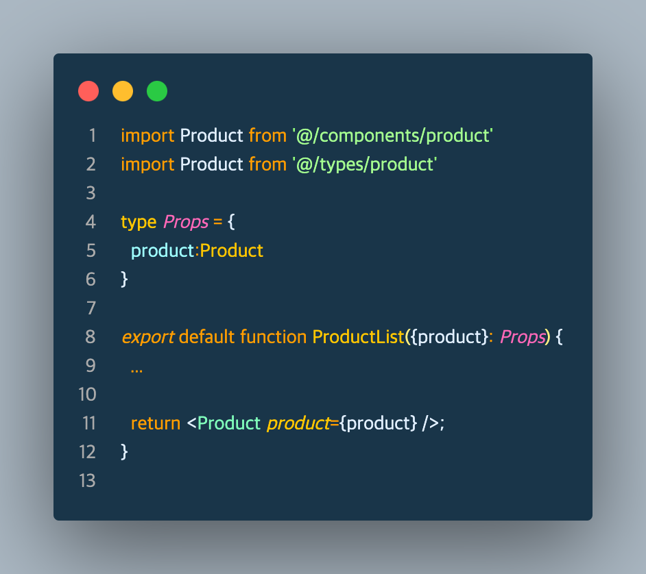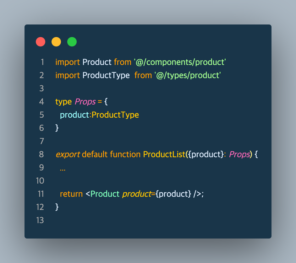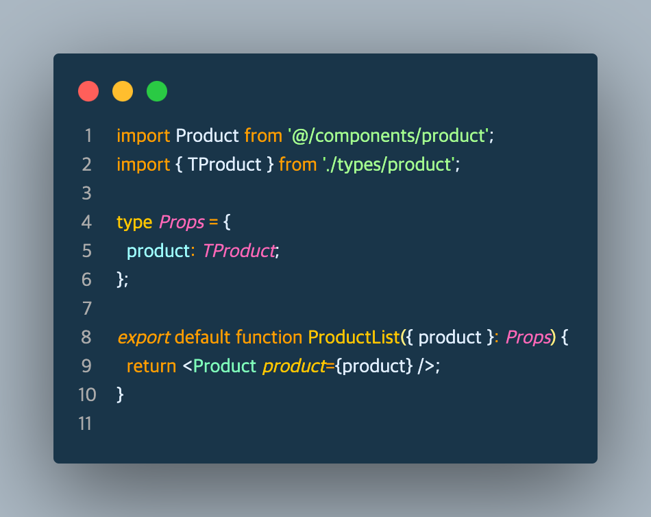 ProductList라는 컴포넌트는 props로 타입이 Product인 product를 받아서, Product 컴포넌트의 props로 전달하면서 Product 컴포넌트를 렌더링해주고 있는데요. 글로 보면 상당히 혼란스럽네요.