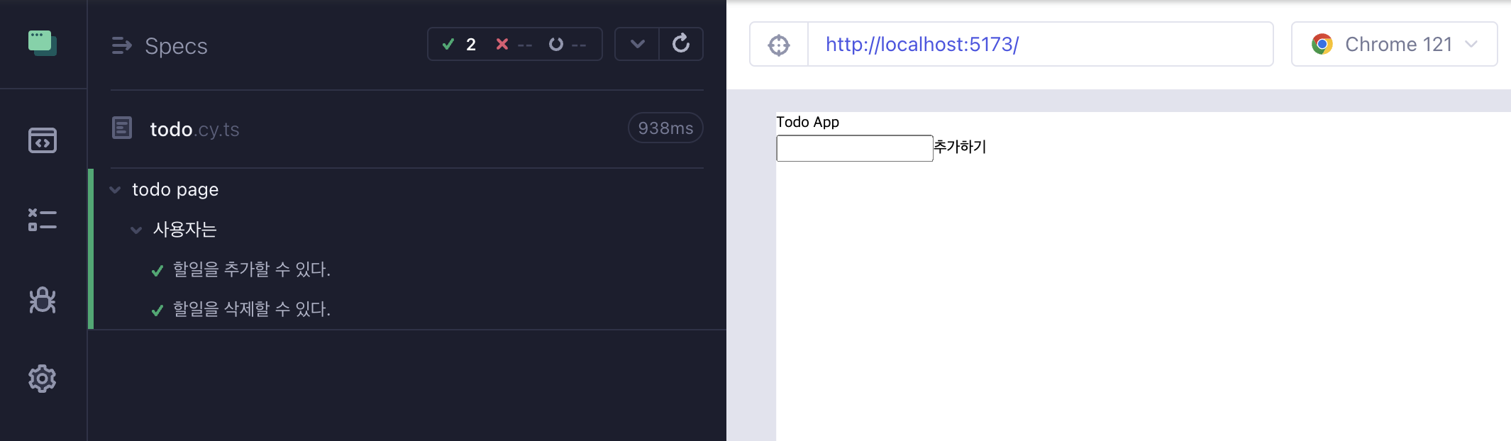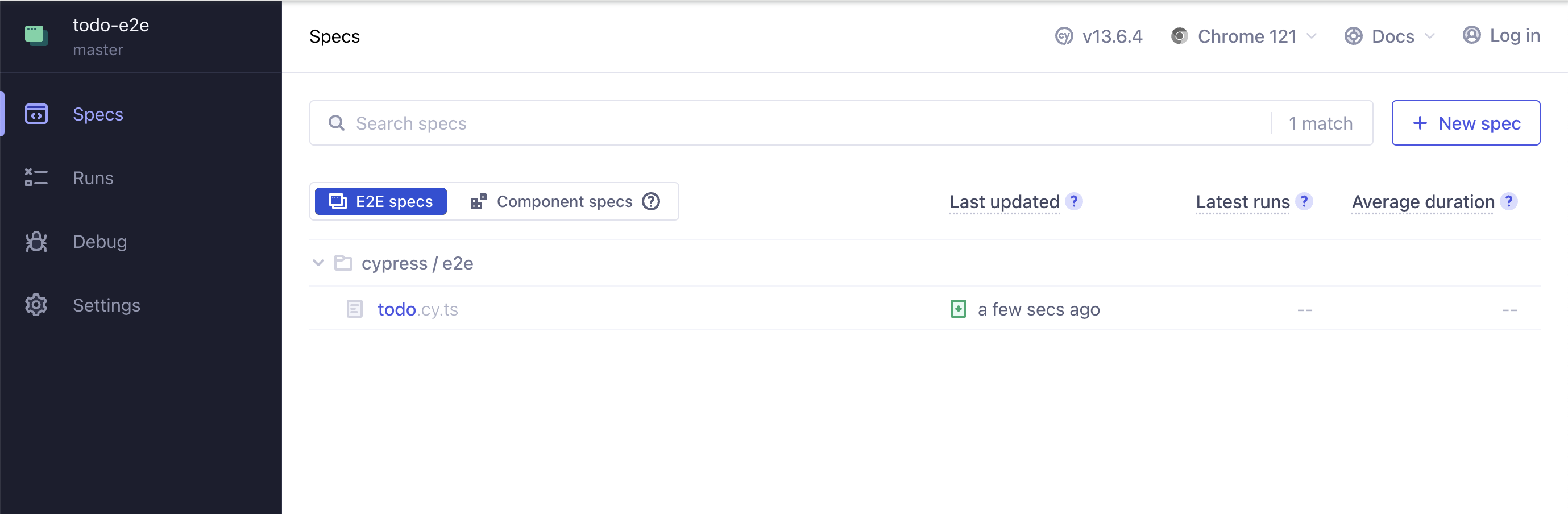 좌측의 Spec 탭에서 방금 생성한 todo.cy.ts 파일을 확인할 수 있어요.