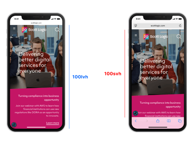 lv*(large)은 컨트롤이 숨겨져 있을 때의 뷰포트 크기입니다. sv*와 lv*는 컨트롤의 표시 여부와 관계없이 고정된 값이라는 점을 기억하세요. dv*(dynamic)은 현재 뷰포트(작든 크든)를 나타냅니다. 이는 뷰포트 전체 높이에 꼭 맞는 레이아웃을 만들려고 할 때 중요하지만, 컨트롤이 사라지는 즉시(예를 들어 사용자가 스크롤을 시작했기 때문에) 변경됩니다. s|l|d를 지정하지 않으면 원래 v*는 lv*(large)와 같습니다.
