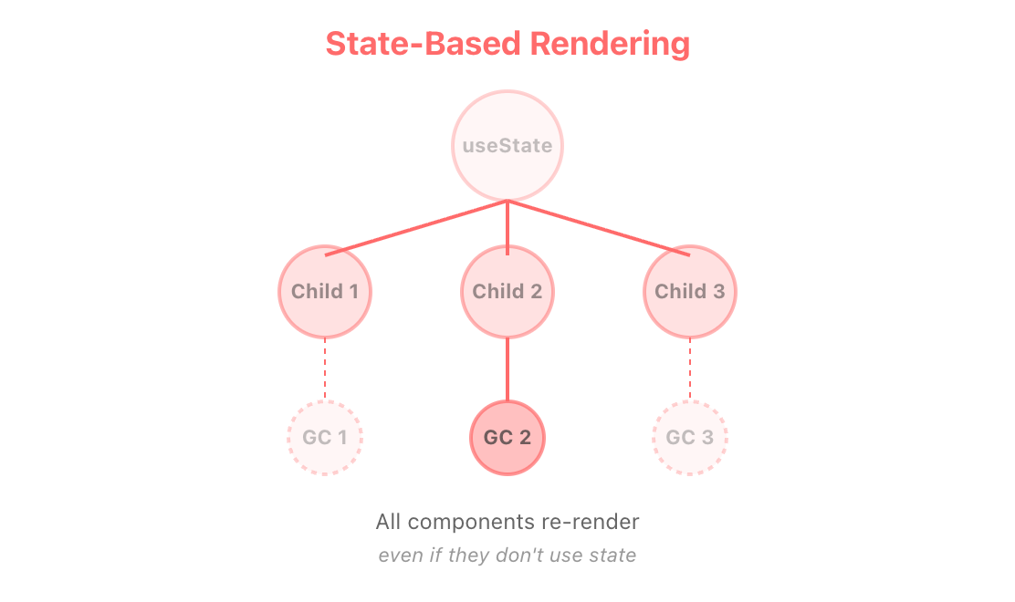 모든 하위 컴포넌트(빨간색으로 표시된 부분)가, 그 상태를 실제로 사용하지 않더라도 전부 리렌더링됩니다. 사실상 업데이트가 필요한 것은 GC 2 단 하나뿐이지만, Child 1, Child 2, Child 3, GC 1, GC 3까지 모두 불필요하게 다시 렌더링되는 것이죠.
