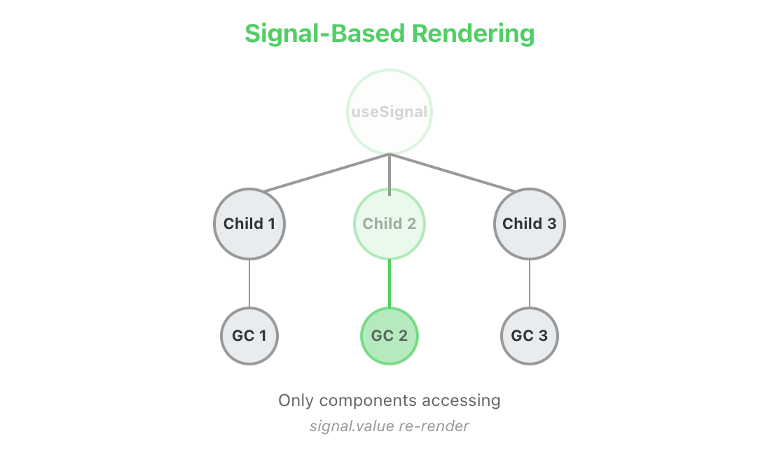 signal.value를 실제로 참조하는 GC 2(초록색으로 표시된 부분)만 리렌더링됩니다. 같은 컴포넌트 트리 안에 있더라도 다른 컴포넌트들(회색으로 표시된 부분)은 전혀 변경되지 않습니다.